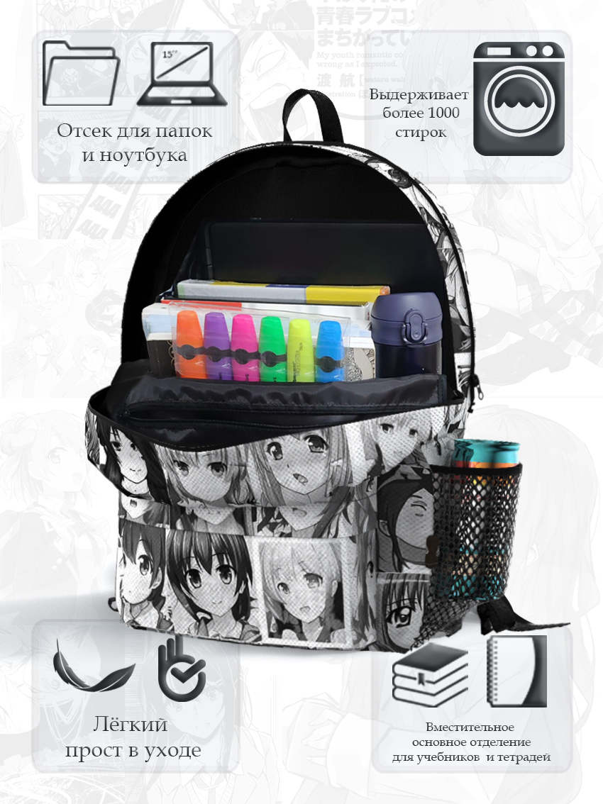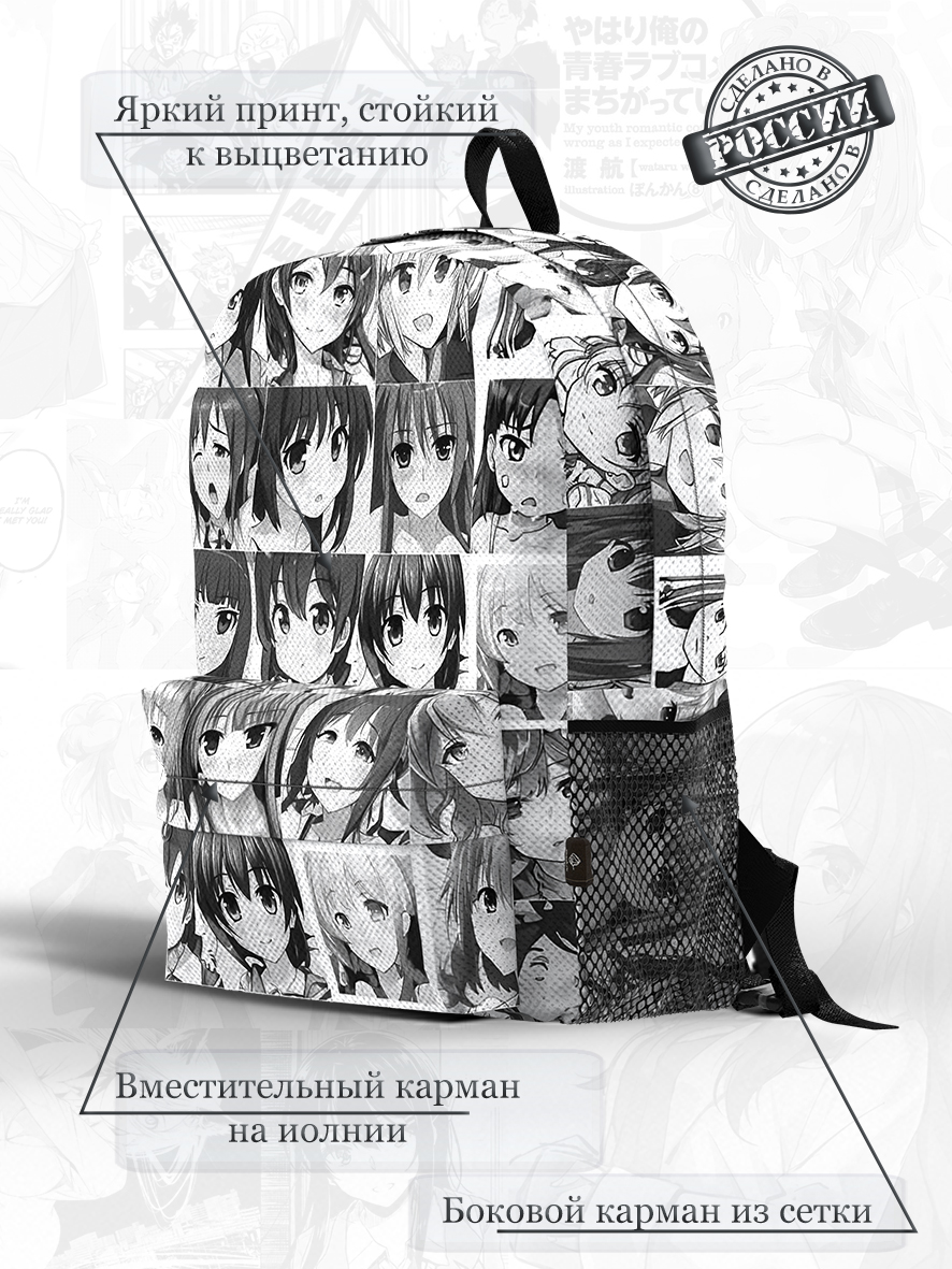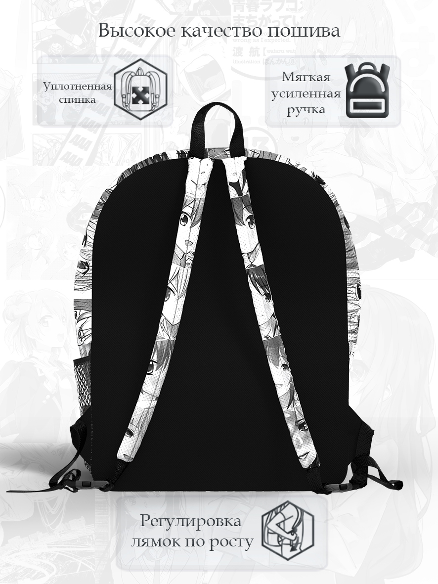 Рюкзак — очень удобный и вместительный, подходит для ежедневного использования как на работу, похода в школу и университет, так и для путешествий. Сделан из надежного текстиля с полноцветной печатью по всей поверхности, в том числе боковых и переднего карманов и усиленных лямок. В компании Гуашь производство каждого изделия индивидуально. Также можно заказать рюкзак со своим именем, классом, группой и увеличенным тиражом.